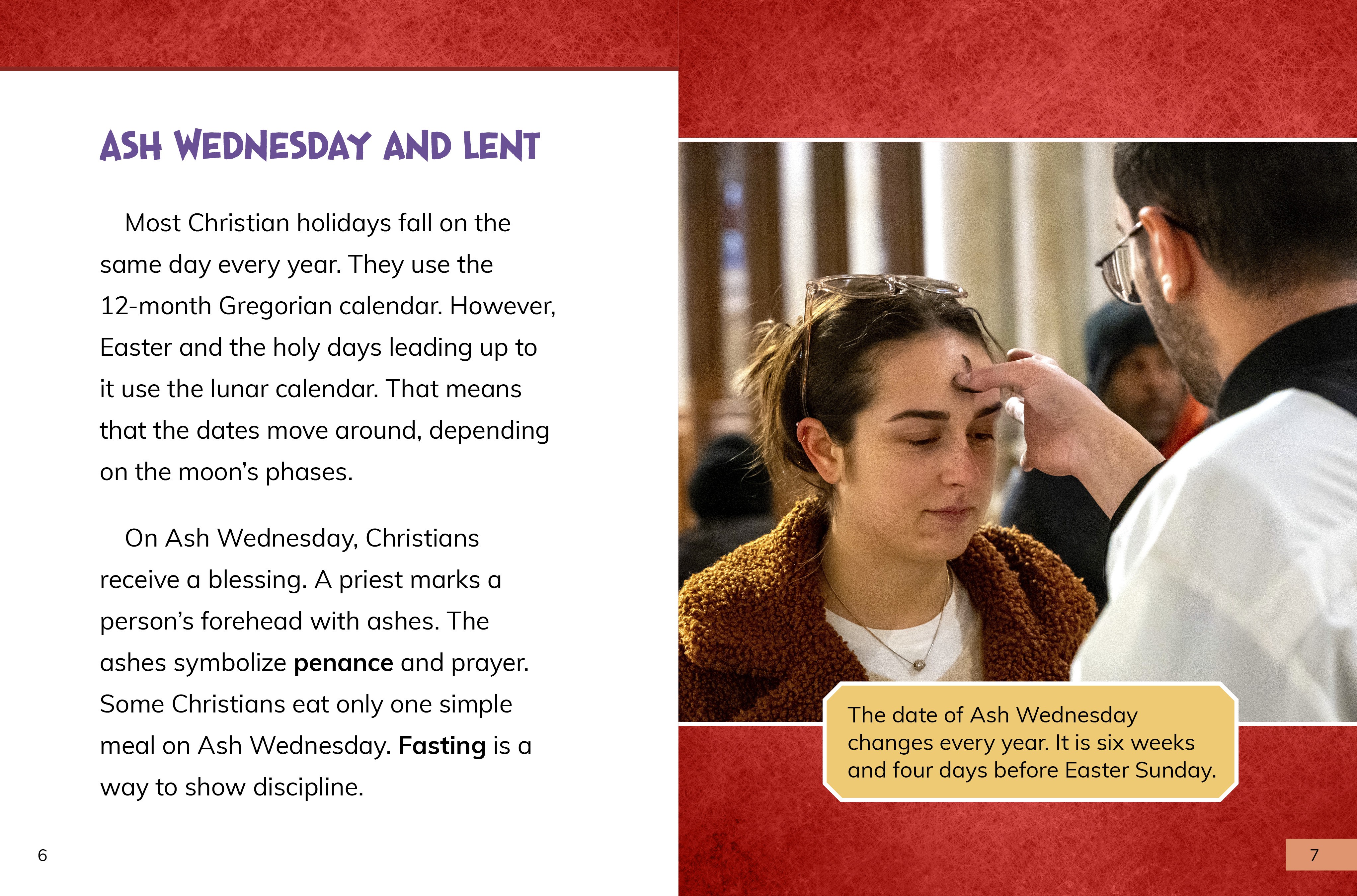Each of the major Christian holidays and festivals includes unique traditions and customs. Some Christians use special calendars to count down the days of the Advent season. Festive carols are sung at Christmas to celebrate the birth of Jesus. In the spring, dyed Easter eggs symbolize rebirth. Clear text and vibrant photos help readers gain a greater understanding of these and other Christian traditions.